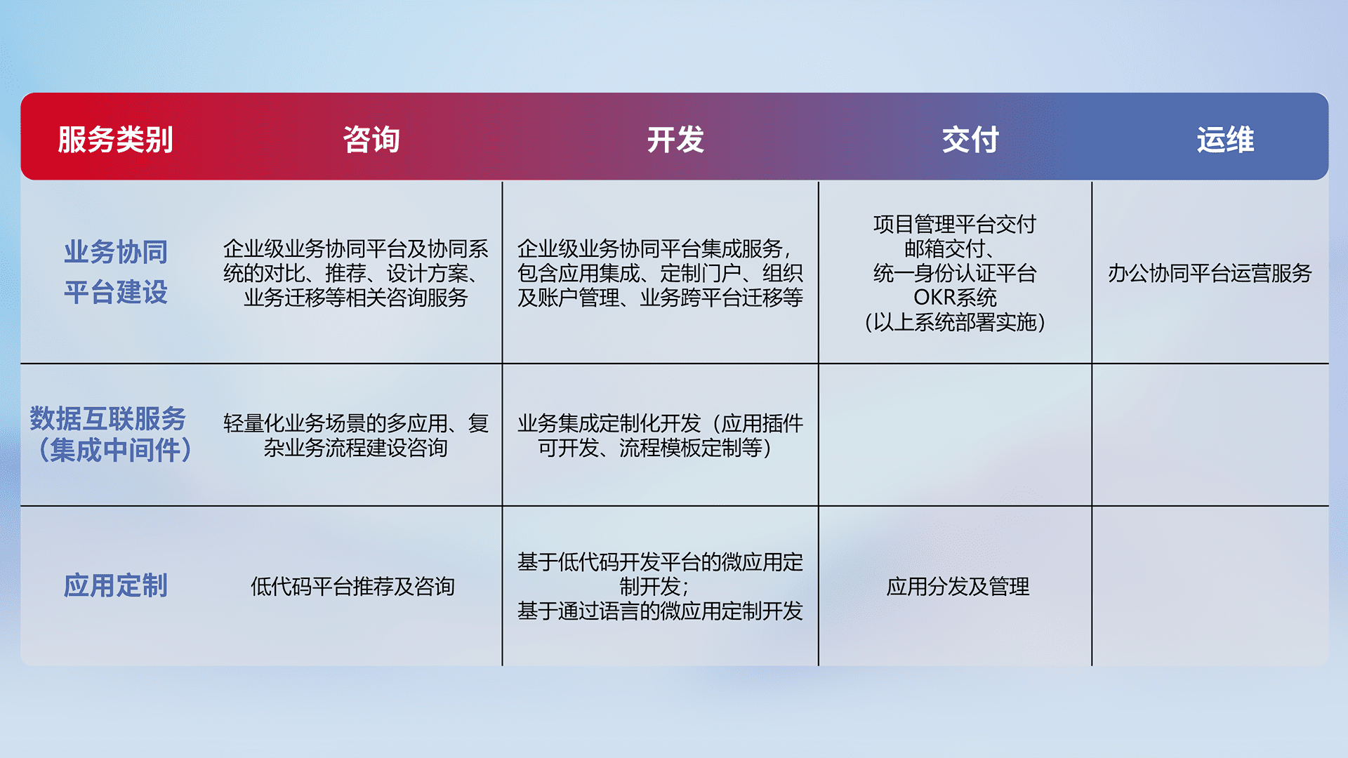 针对钉钉、、、、企微、、、IDaas等平台级产品提供产品的规划、、方案、、、、交付、、定制化开发等服务,,,,实现如统一协同办公、、智能客户服务、、混合会议管理、、、智能数据查询、、等业务场景,,,,实现数字化转型。。
